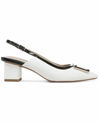- Square-toe slip-on slingback pumps with adjustable buckle closure