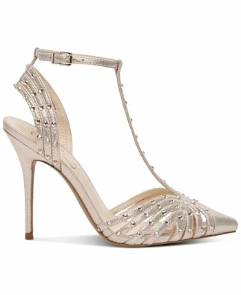 Jessica Simpson’s Wisata pumps blend slender T-straps and rhinestone sparkle atop sleek stiletto heels for a gorgeous silhouette.
